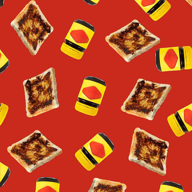 Aussie Food Bush Tucker Bites Spread on Toast Toss Red 4106D Cotton Quilting Fabric is from the Aussie Food Bush Tucker Collection designed for Kennard and Kennard