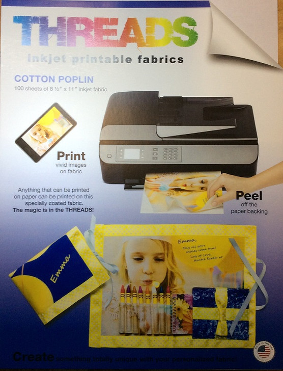 Inkjet Printable Cotton Poplin Fabric A4 Threads 5 Sheets 8 1/2 in x 11 in (21.59 x 27. 94cms) is made by Threads USA. Quilt-weight (4 oz) cotton. Create custom quilting fabrics using your own inkjet printer. The smooth surface produces sharp prints with fine details and vivid colors. Easily peel off the paper backing and sew your personalized fabric to make quilts, pillows, purses, clothes.. How to use Inkjet Printable Fabric - Prepare your image to the correct size on your computer and be sure to set the print quality to "best to ensure your photo quality is at its maximum. If your piece of fabric has any loose threads make sure you tidy the edge with scissors before putting the sheet into the printer. DO NOT pull at the threads. Place your fabric on the tray of your INKJET printer and start printing. Once printing is complete, to avoid smudging, leave fabric in the tray and do not touch it until it is dry.